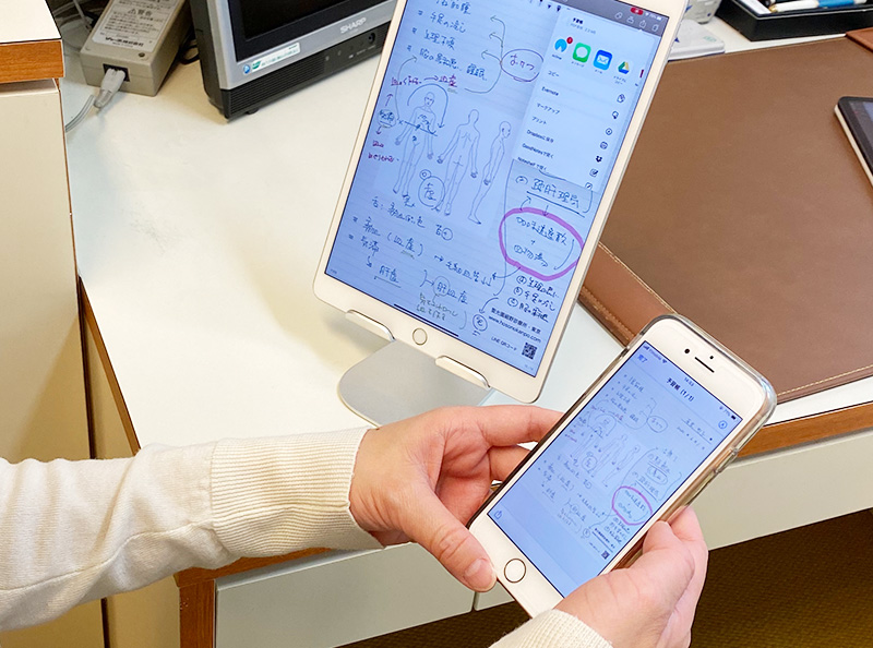 診察時の患者さまへの説明にiPadを使用しています。医師が手元のiPadに書き込む内容がリアルタイムで皆さまの目の前に置いたiPadに映し出されます。現在の所、アトピー性皮膚炎や女性系疾患、不妊症などの初診時の説明に使用していますが、処方が変更になる時やまた他の疾患に対しても順次適応を拡大して行く予定です。